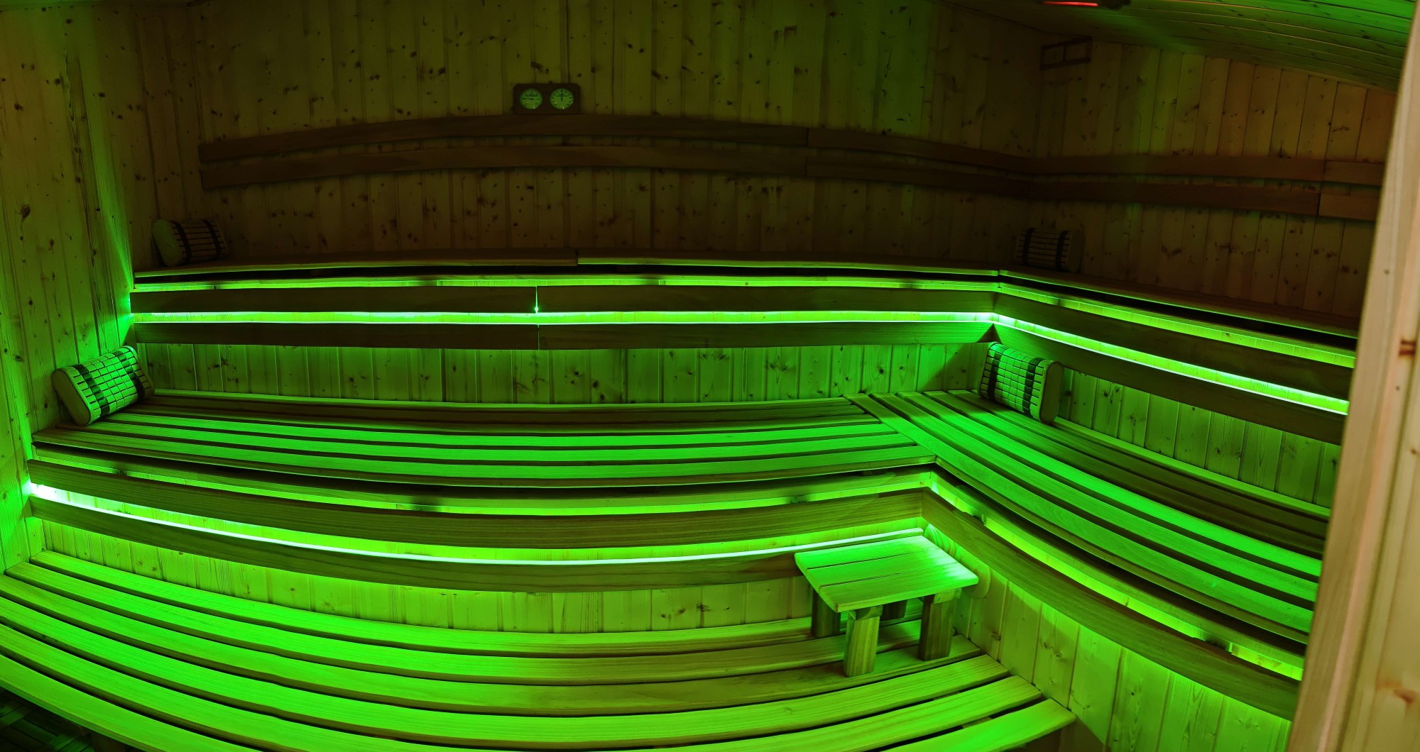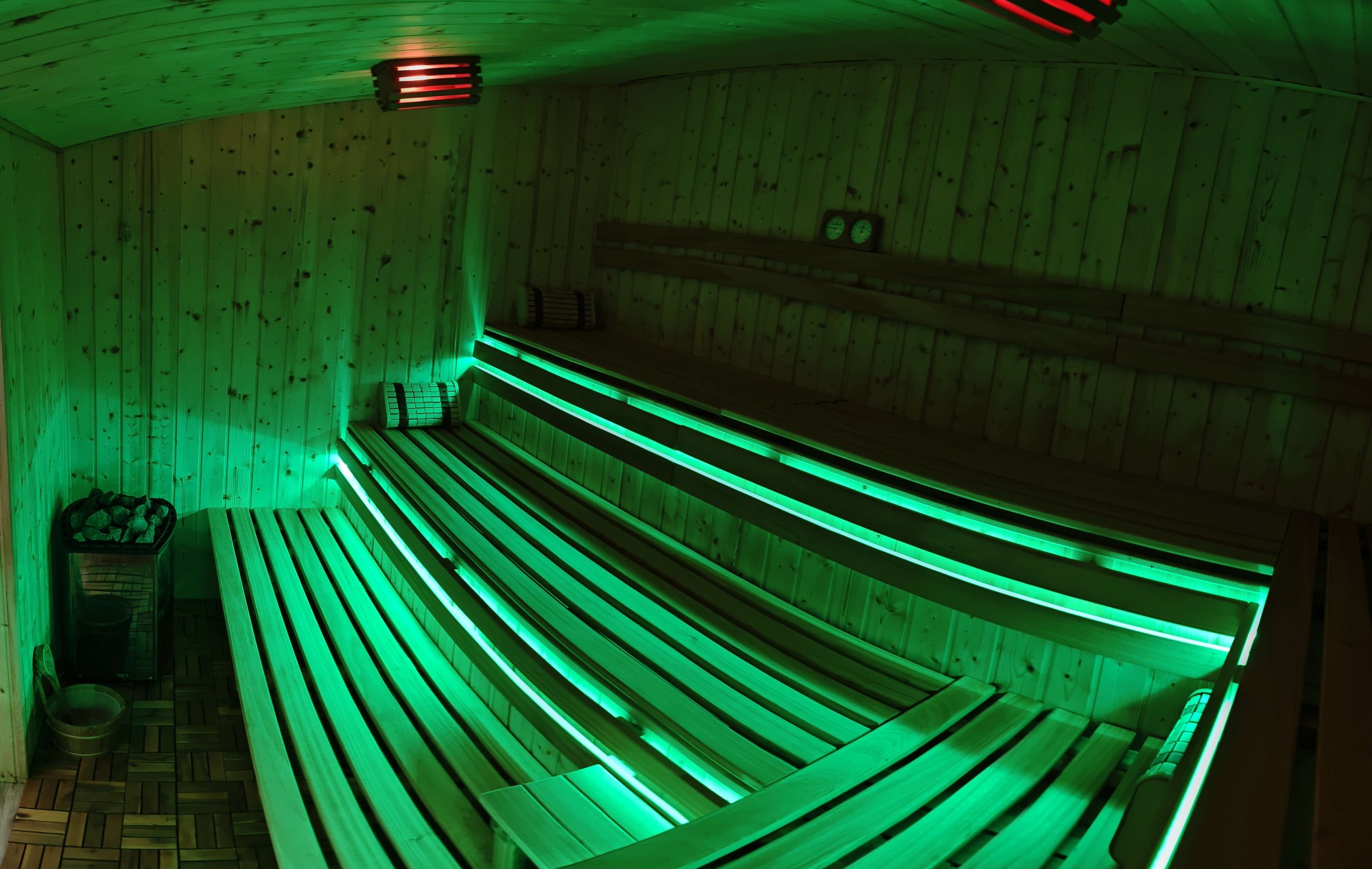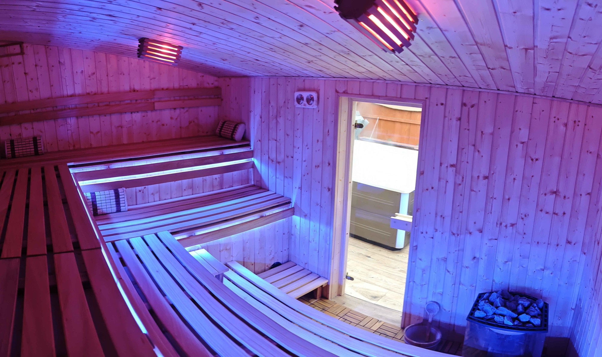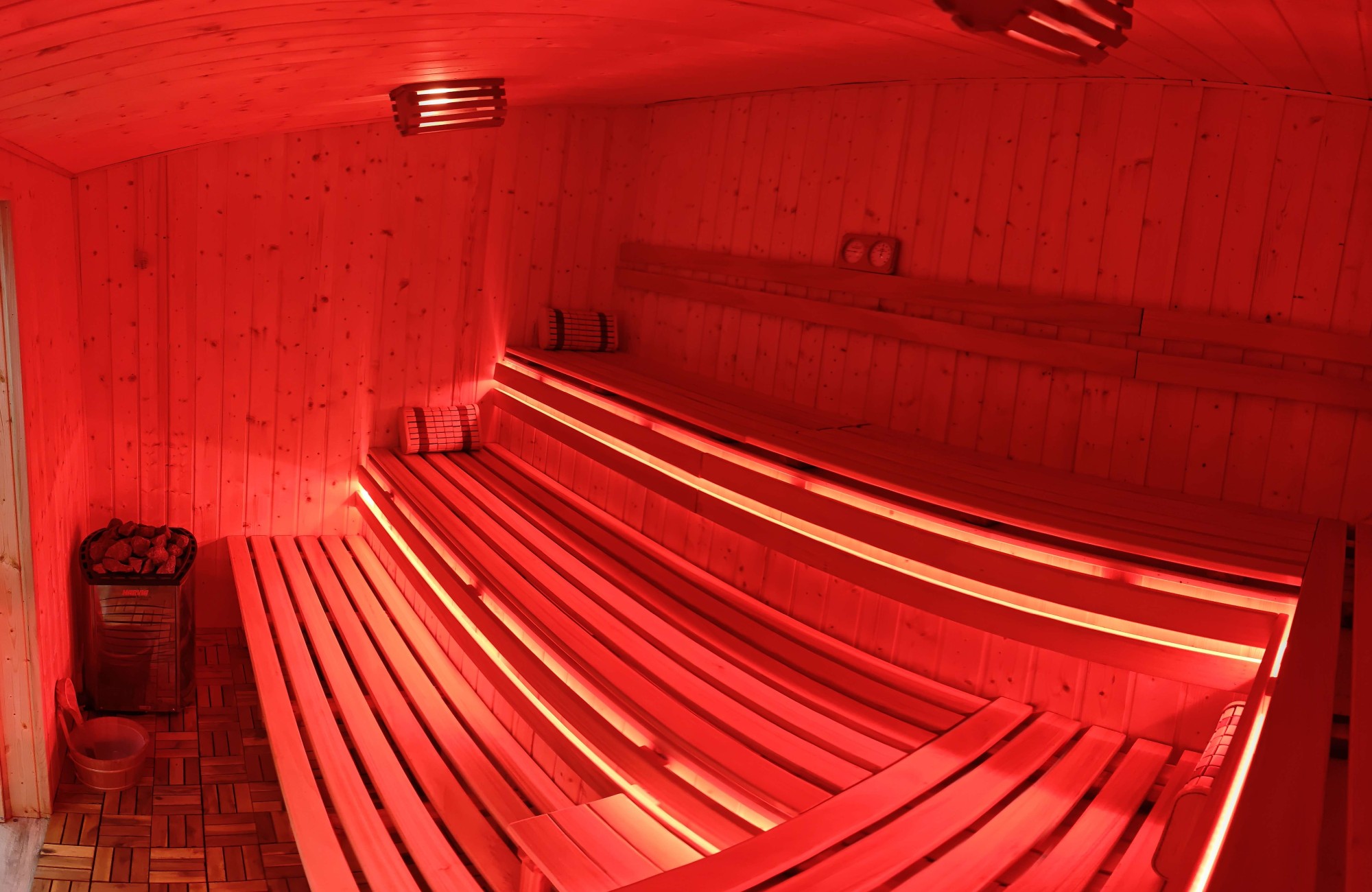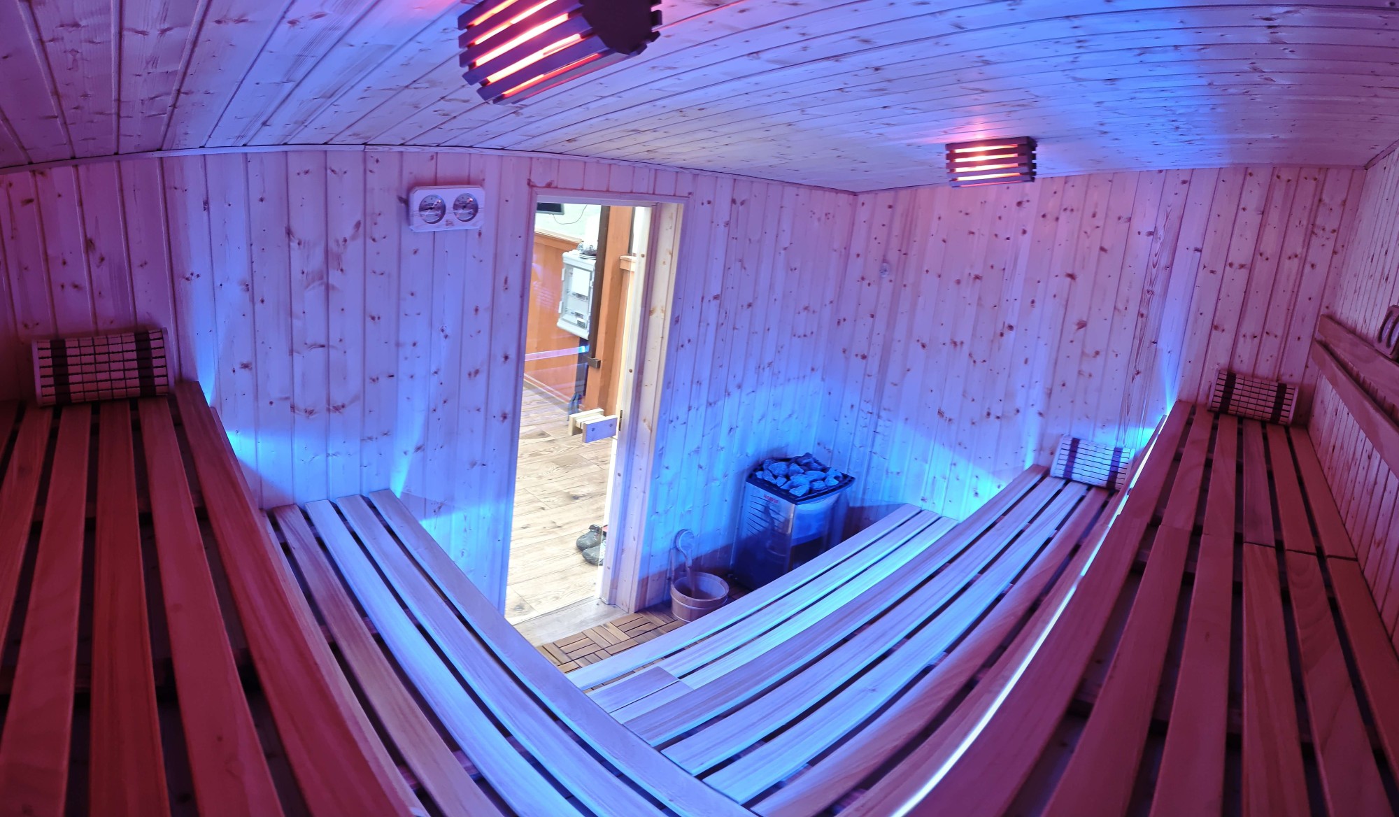 Nowa sauna posiada duża i komfortową przestrzeń, podzieloną na trzy różne poziomy szerokich ławek aby każdy z gości mógł wybrać dogodną dla niego temperaturę oraz pozycję.